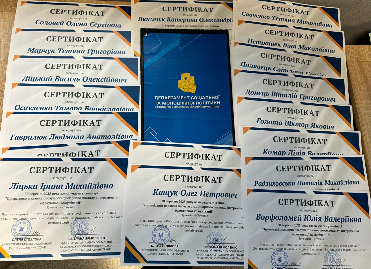 Департамент соціальної та молодіжної політики ОВА спільно з Вінницьким обласним центром соціальних служб провели навчально-практичний тренінг на тему: «Організація надання соціальної послуги стаціонарного догляду відповідно до затвердженого Державного стандарту. Інструменти ефективної комунікації».