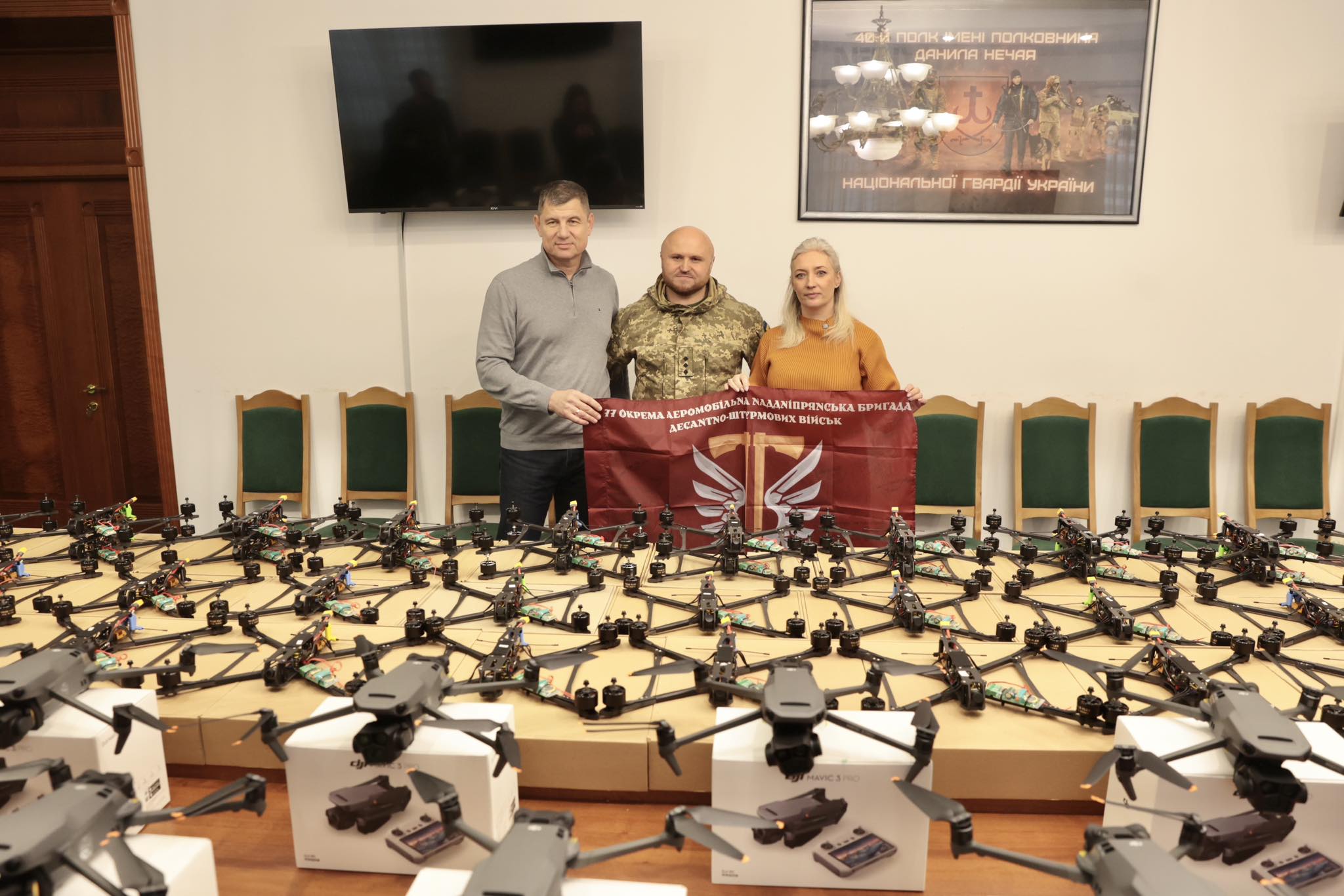 Перша заступниця начальника ОВА Наталя Заболотна та заступник голови обласної Ради Анатолій Ткач передали воїнам 77 окремої аеромобільної Наддніпрянської бригади 15 безпілотників DJI Mavic 3 Pro та 40 FPV 10.
