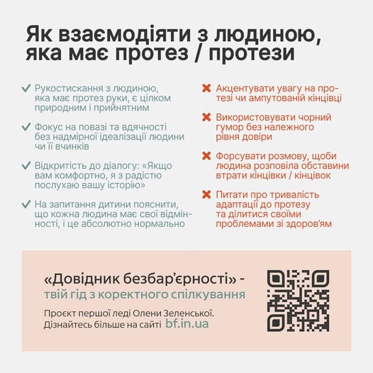 Тонкощам коректної взаємодії з різними людьми, у тому числі зі співрозмовниками, які мають один або кілька протезів, присвячений один із матеріалів оновленого розділу «Довідника безбар’єрності» (https://bf.in.ua/ethics/liudyna-z-protezom-protezamy). Він рекомендує не акцентувати увагу на ампутації кінцівок, оскільки це може створити відчуття незручності.