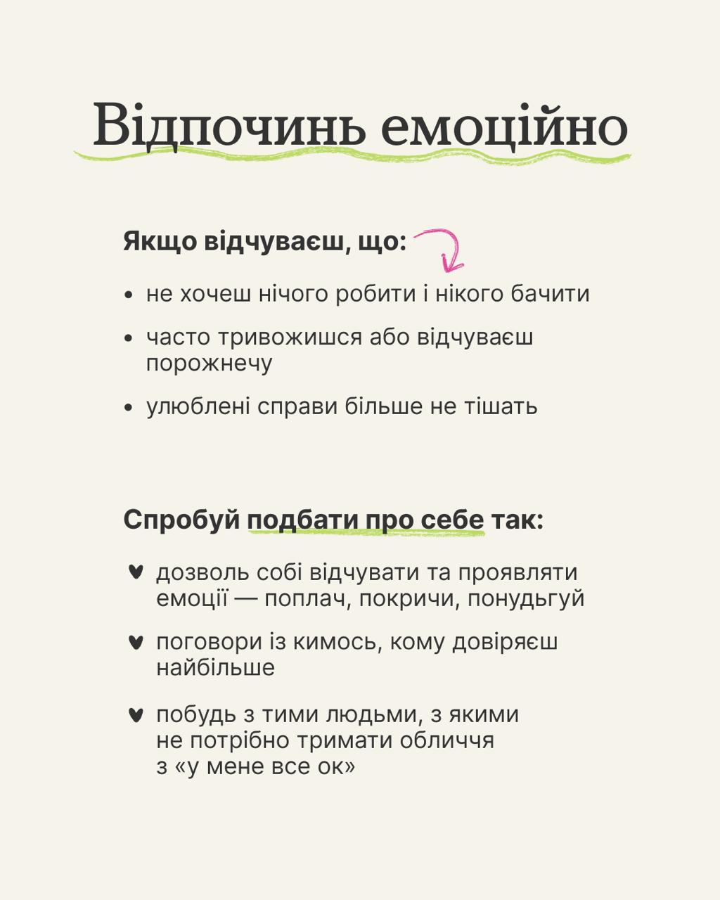 І це окей. У каруселі знайдеш три типи втоми й прості способи, як відновитися по-справжньому. Комбінуй їх, якщо потрібно, і не забувай дбати про себе. Домовились?