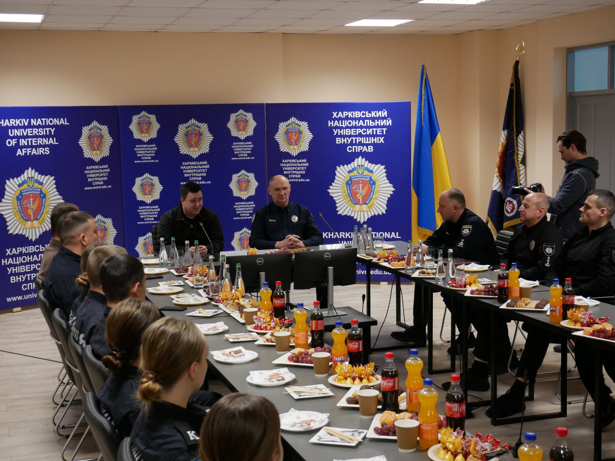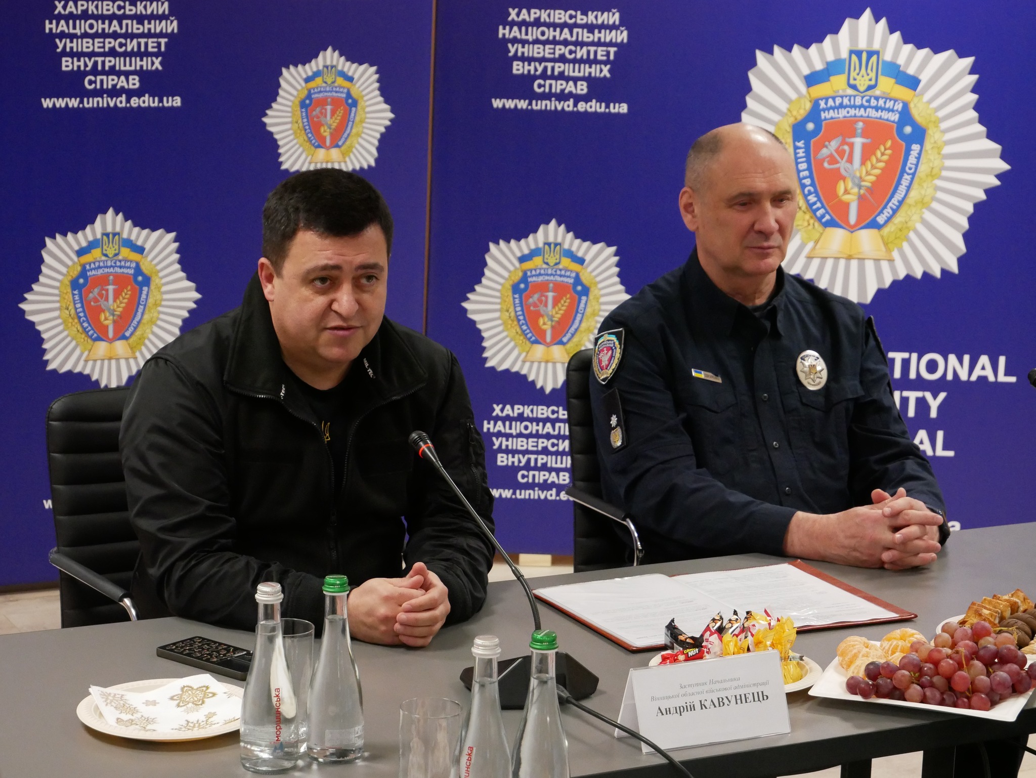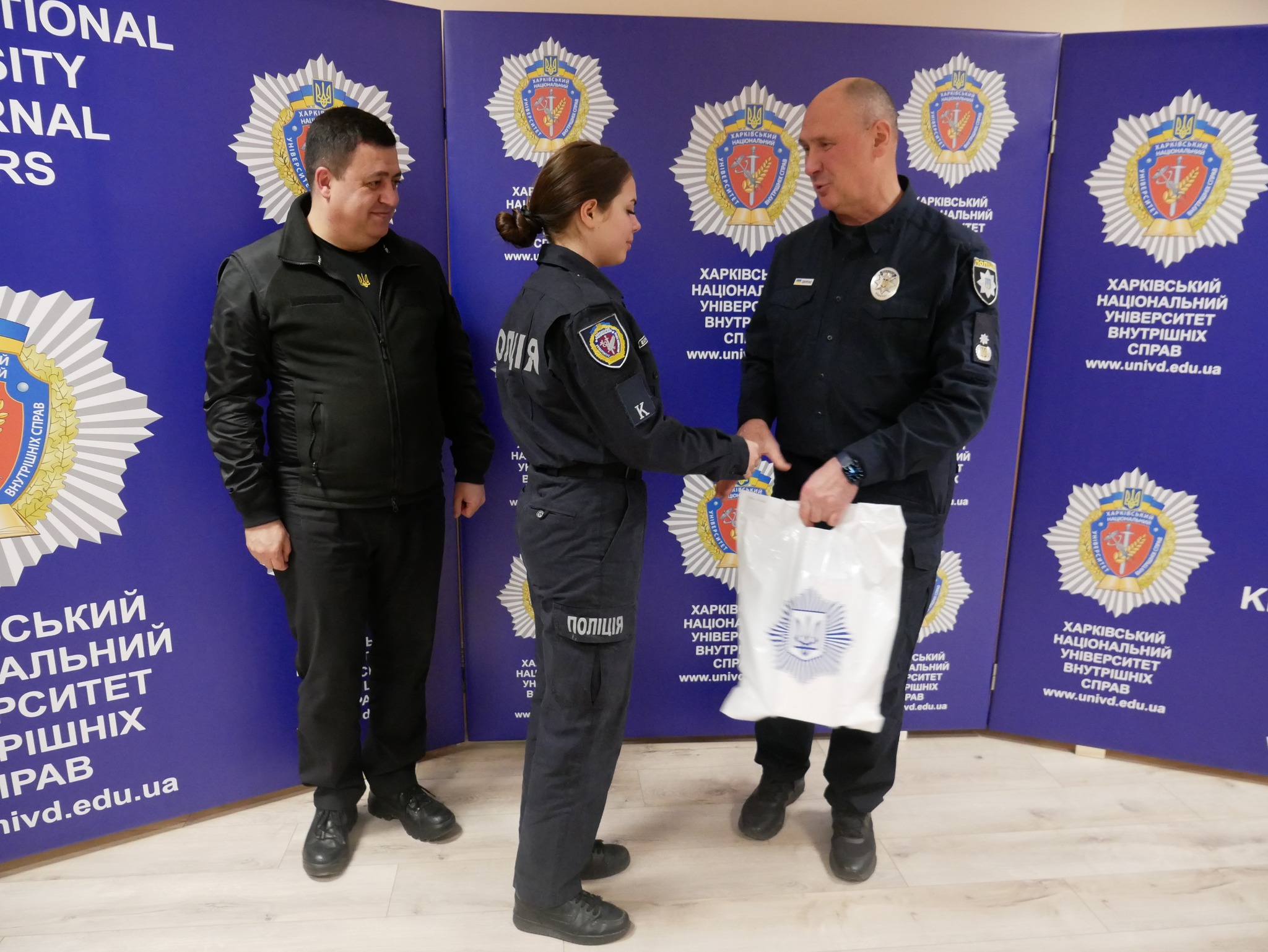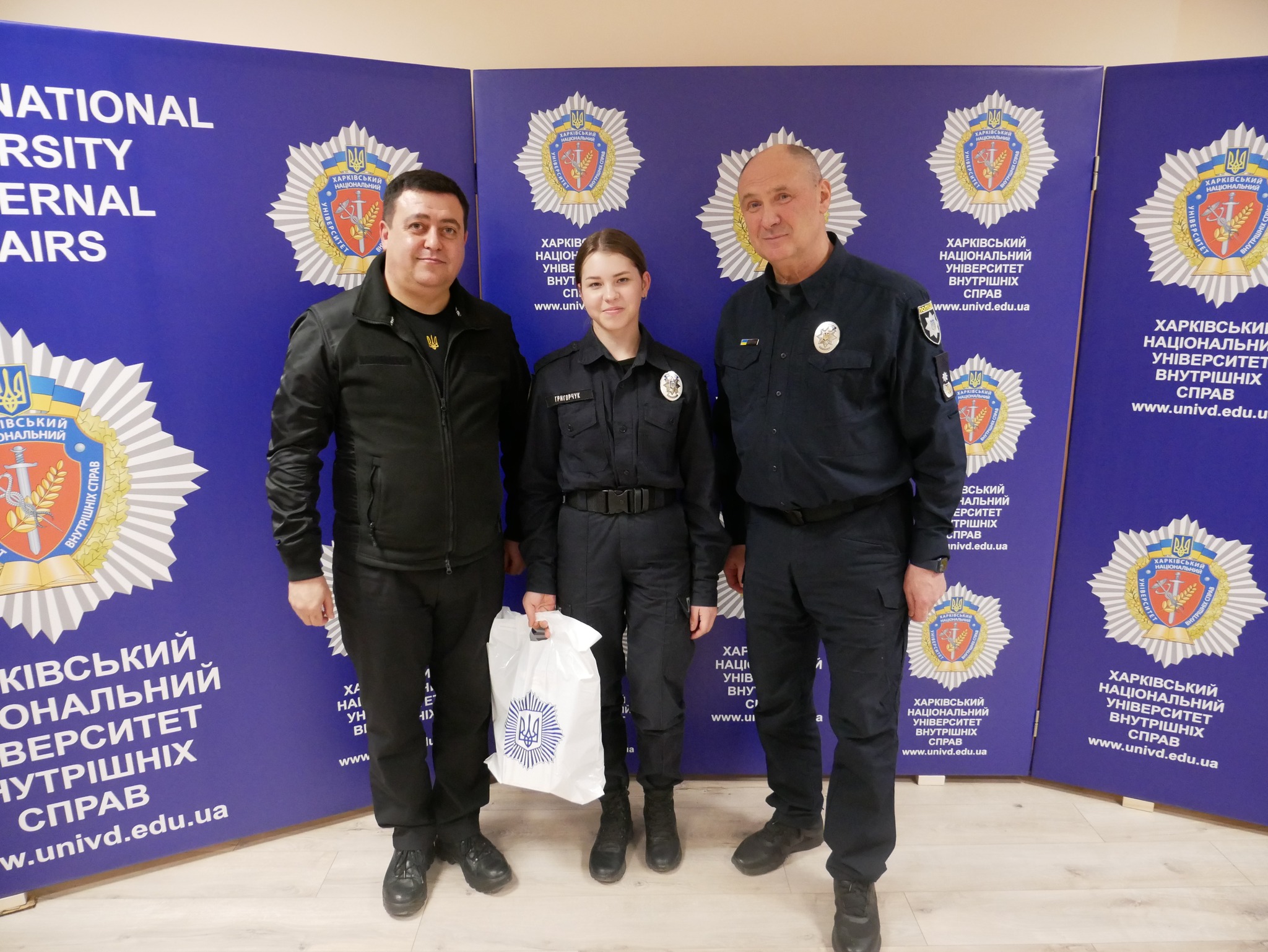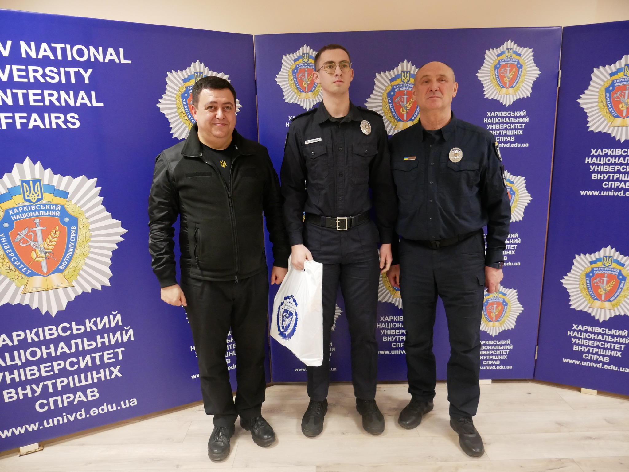 Заступник начальника ОВА (CDTO) Андрій Кавунець разом із ректором ХНУВС, генералом поліції третього рангу Валерієм Сокуренком, вручили дітям подарунки — маленькі символи турботи, які зігріватимуть їх у зимові дні.