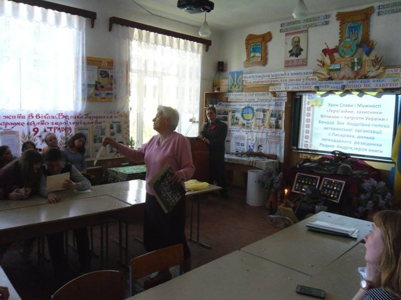 Гідними продовжувачами бойової слави своїх дідів і прадідів є сьогоднішні воїни АТО. Не вщухає з роками біль утрат в українських сім’ях. Музей створив грандіозну тематичну експозицію «Пам’ятаємо! Перемагаємо!». Відходять у вічність ветерани Другої світової війни, але пам’ять про їх подвиги вічна! На музейний урок Мужності і Слави завітала голова ветеранської організації с.Писарівки Зоя Андріївна Бондар. Її батько, Андрій Микитович Редько - легендарний розвідник, односельчанин, кавалер багатьох бойових орденів та медалей. Давно вже немає серед нас Андрія Микитовича, але спогади про героя будуть вічними. - Пам’ять про мого батька, каже Зоя Андріївна - оживає, коли беру до рук вицвілі воєнні фотографії, перечитую пожовклі аркуші фронтових листів. А справжньою сімейною реліквією стала нещодавно надіслана із братнього нам Узбекистану книга його однополчанина.