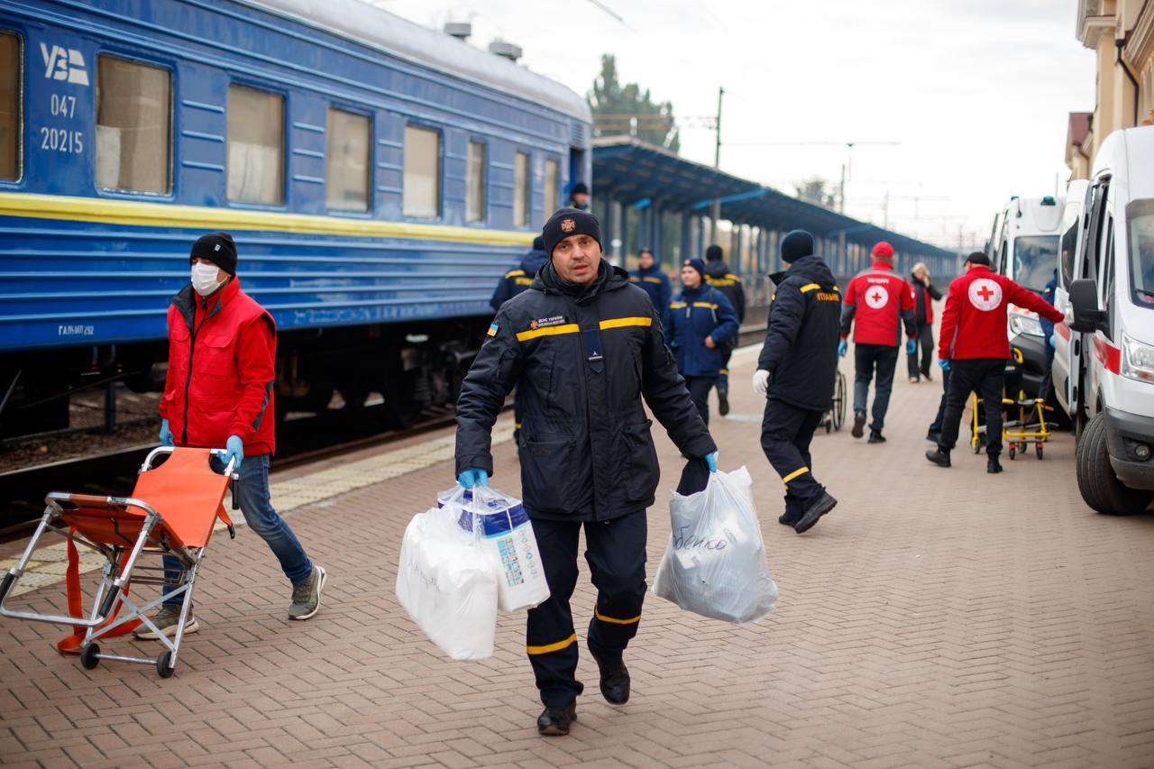 За координації Вінницької обласної військової адміністрації, у співпраці з представниками ГУ ДСНС, УПП, Червоного Хреста, Укрзалізниці, комунального некомерційного підприємства «Територіальне медичне об’єднання «Вінницький обласний центр екстреної медичної допомоги та медицини катастроф Вінницької обласної Ради» було організовано зустріч евакуаційного потягу, медичний супровід, допомогу у висадці та транспортуванні громадян до місць подальшого проживання.