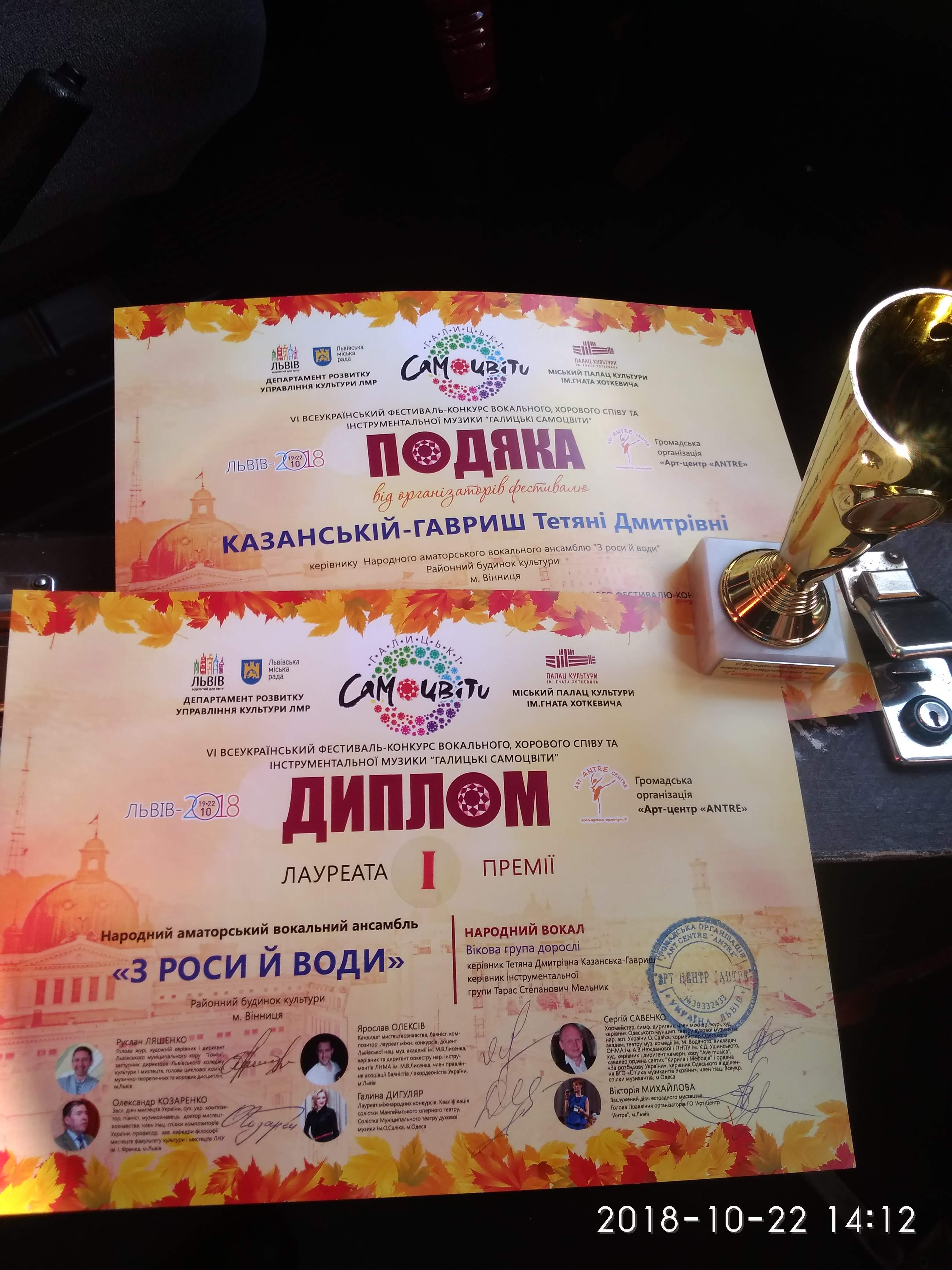 З 20 по 22 жовтня у місті Лева відбувся VI Всеукраїнський фестиваль-конкурс вокалу та інструментальної музики «Галицькі самоцвіти». До участі у конкурсі організаторами - Арт-центром «Антре» був запрошений народний аматорський вокальний ансамбль «З роси й води» Вінницького районного будинку культури.