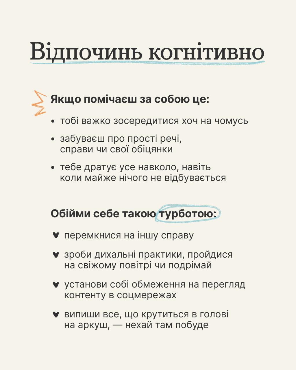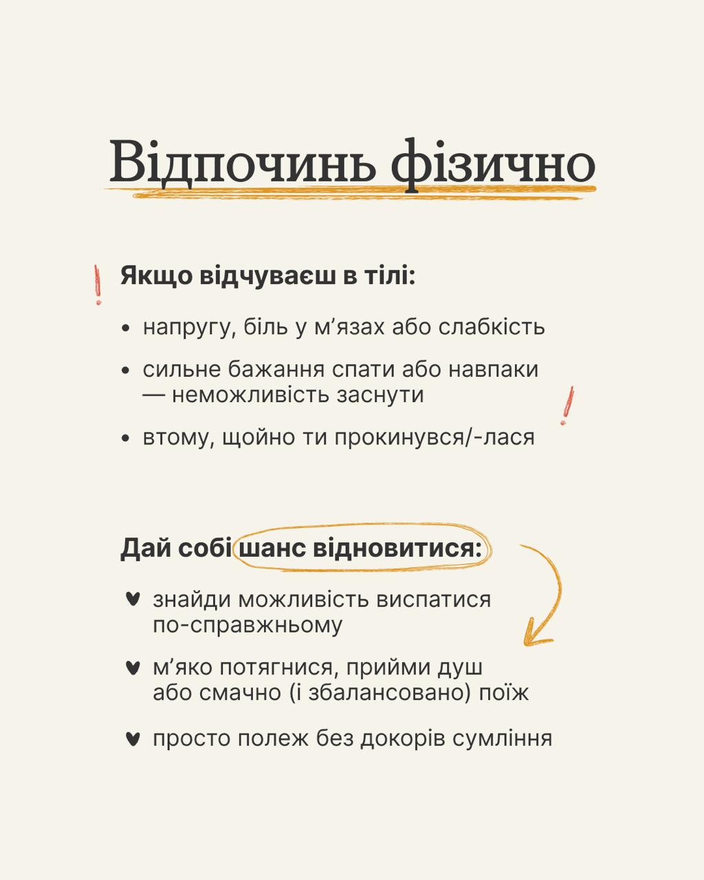 І це окей. У каруселі знайдеш три типи втоми й прості способи, як відновитися по-справжньому. Комбінуй їх, якщо потрібно, і не забувай дбати про себе. Домовились?
