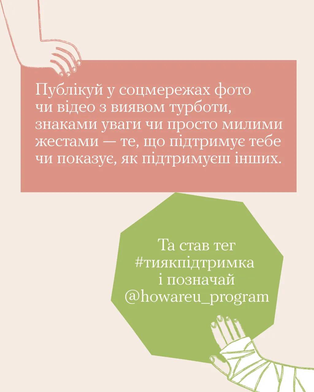 Вони у твоїх руках. Покажи іншим, що ти бачиш турботу в моментах. А ми покажемо їх і іншим, а інші — ще іншим… Щоб простягнути руки підтримки тим, кому вона потрібна зараз.
