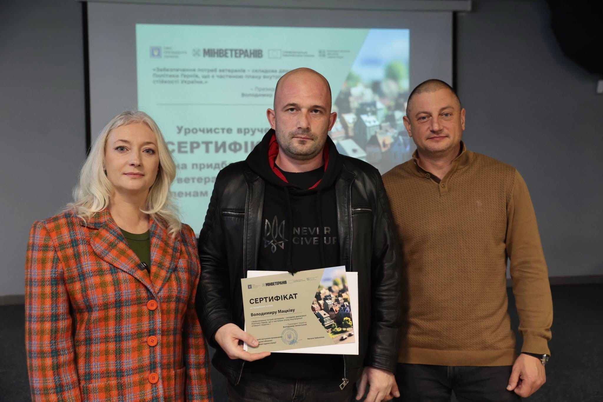 Перша заступниця начальника ОВА Наталя Заболотна вручила сертифікати на придбання житла ветеранам війни та членам родин загиблих. До заходу також долучився директор Департаменту ветеранської політики ОВА Андрій Грачов.