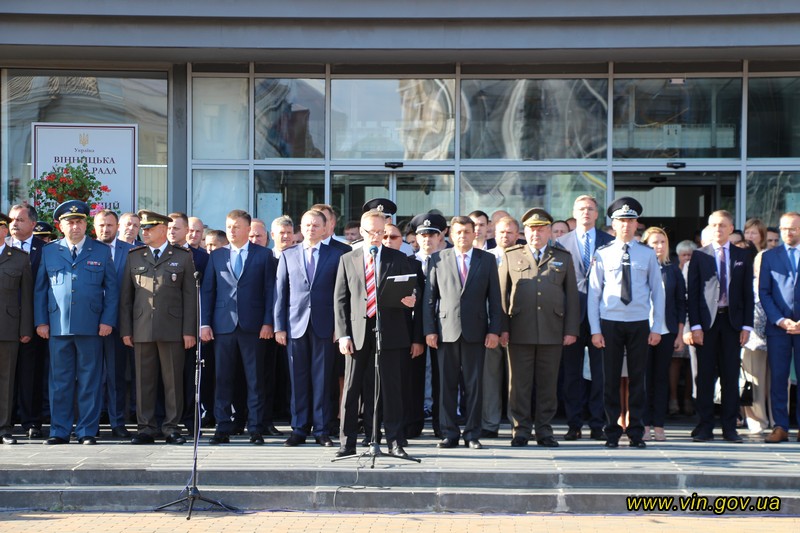Почесне право підняти Прапор в обласному центрі було надано розвіднику групи спеціального призначення загону спецпризначення 73-го морського Центру спеціальних операцій, старшому матросу Володимиру Каширцеву. Герой нагороджений медаллю Президента України «Захиснику Вітчизни», відзнакою Президента України «За участь в антитерористичній операції», нагрудним знаком Міністра оборони України «За зразкову військову службу», відзнаками Союзу ветеранів військово-морської розвідки «За сприяння» та «За незламність духу», а також медалями «Матрос Кошка» та «Учасник АТО». Разом із Володимиром Каширцевим право урочистого підняття Державного Прапора надано учениці 10 класу школи-ліцею №7, призерці Всеукраїнської олімпіади з географії, переможниці міської та обласної олімпіад з німецької мови та з географії, активній учасниці молодіжного телепроекту «Ліцеїст» Анні Гижко, а також учневі 10 класу фізико-математичної гімназії №17, переможцю Всеукраїнської олімпіади з фізики, обласних олімпіад з фізики та математики, стипендіату Вінницької міської ради Олександрові Клименку.