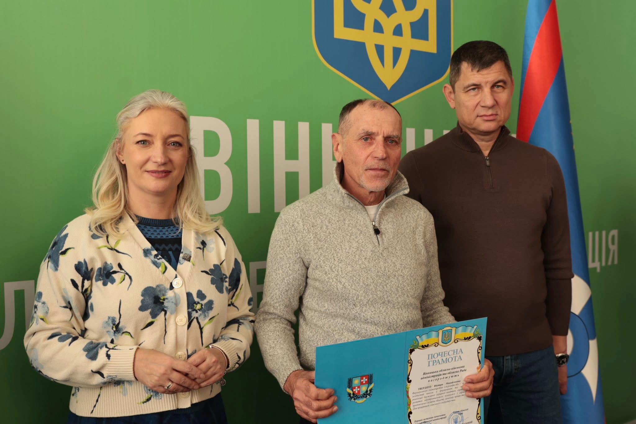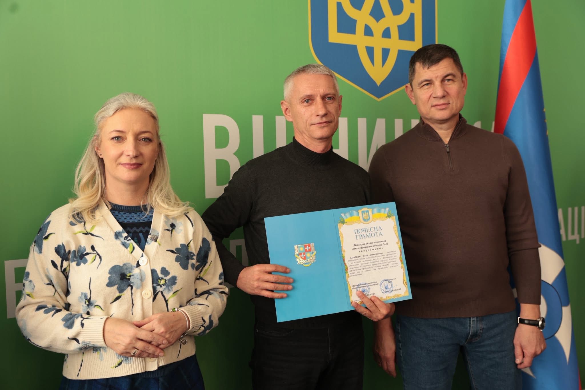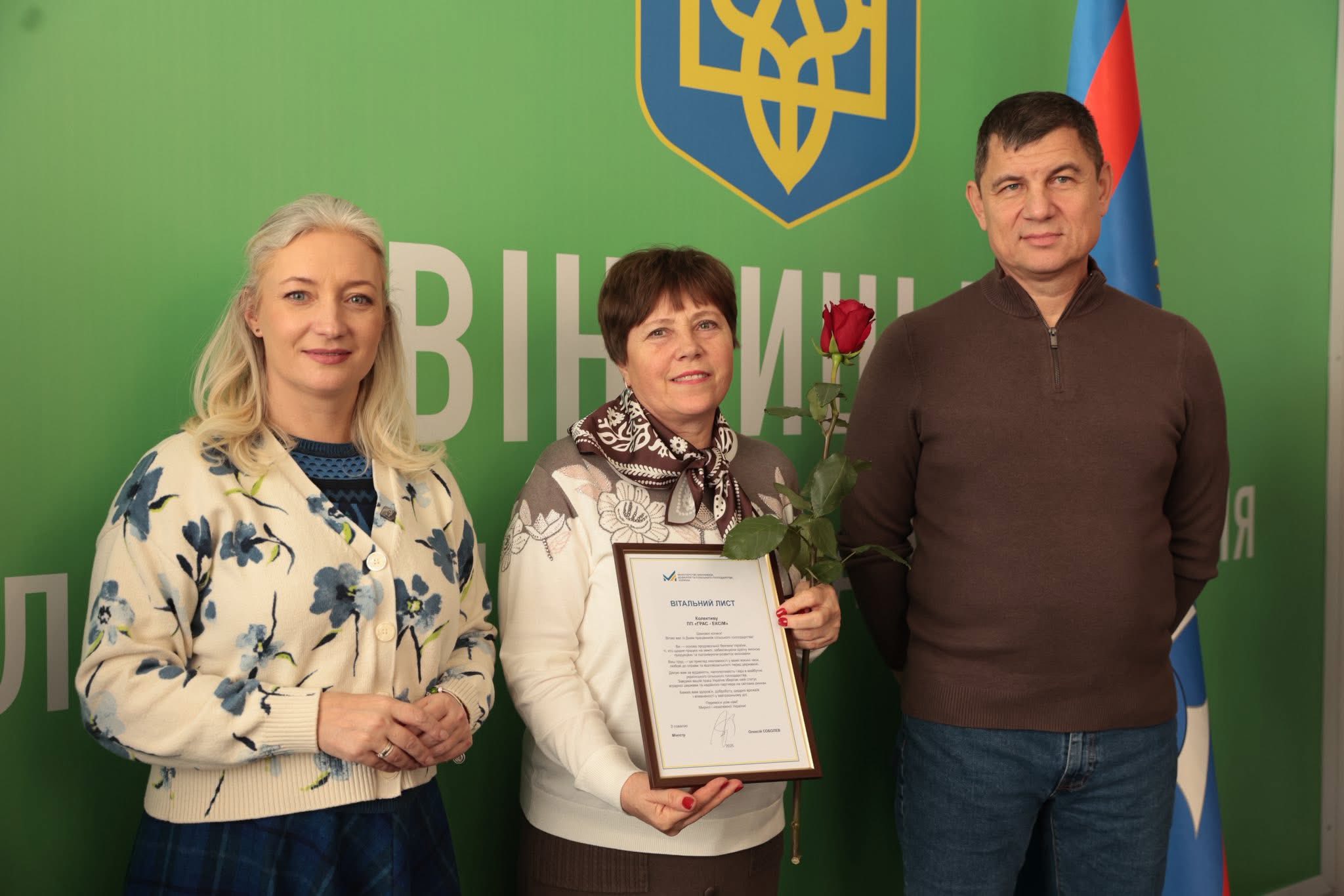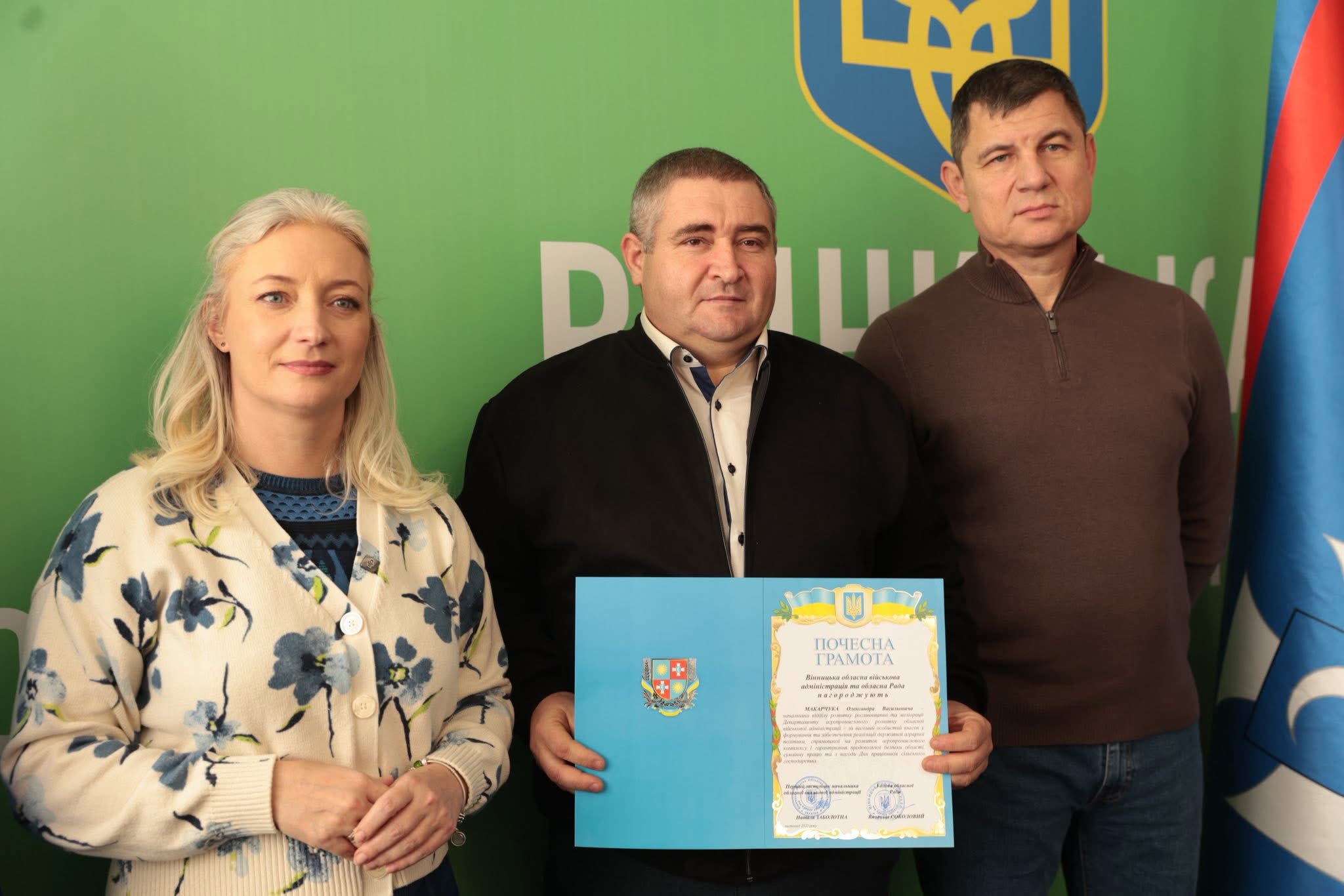 Щорічно у третю неділю листопада в Україні відзначають День працівників сільського господарства. З цієї нагоди Перша заступниця начальника ОВА Наталя Заболотна та заступник голови обласної Ради Анатолій Ткач вітальними листами Міністерства економіки, довкілля та сільського господарства України, а також почесними грамотами Вінницької обласної військової адміністрації та Вінницької обласної Ради нагородили сільськогосподарські колективи області. Також до заходу долучився заступник начальника ОВА Сергій Здітовецький.