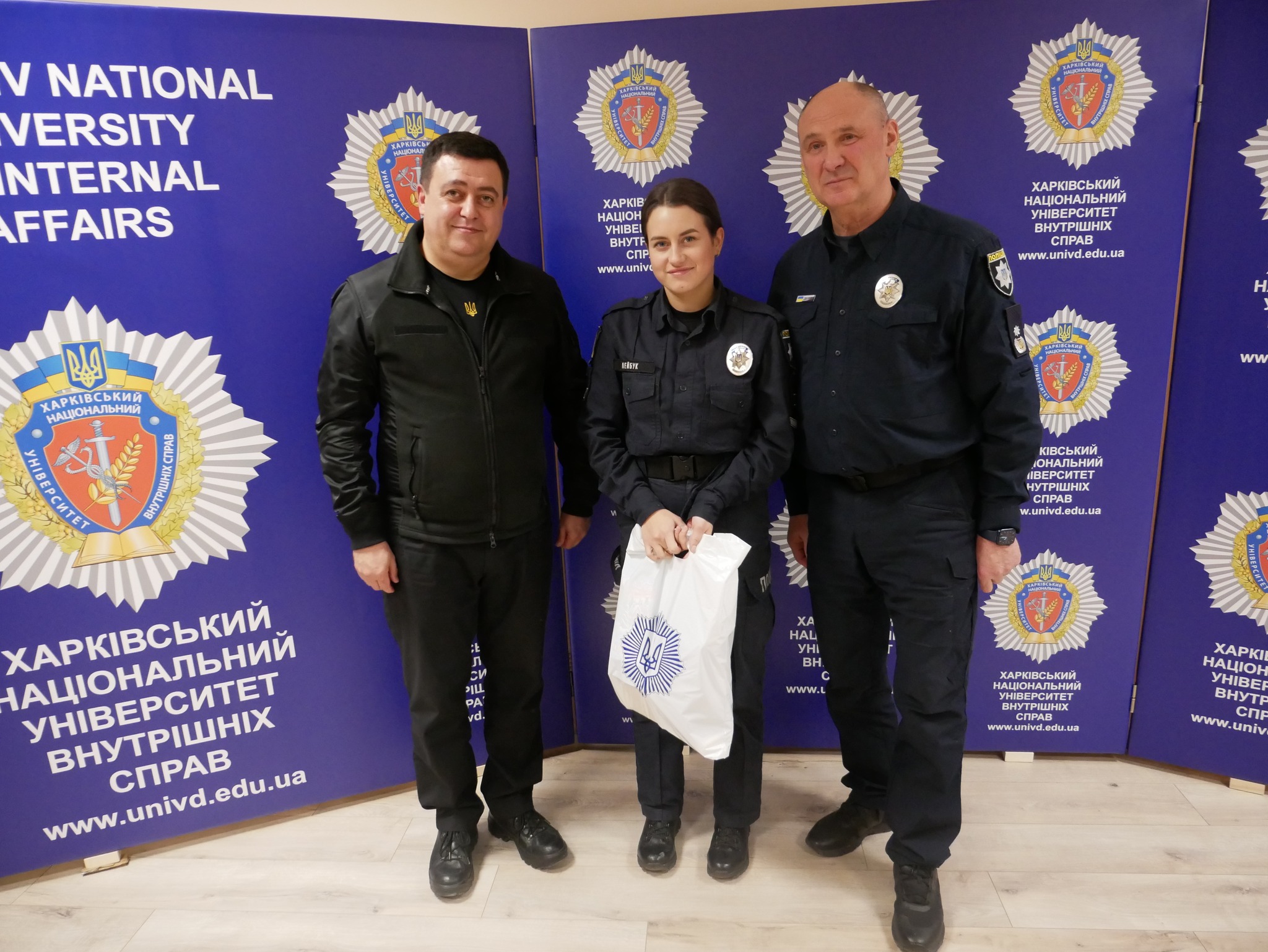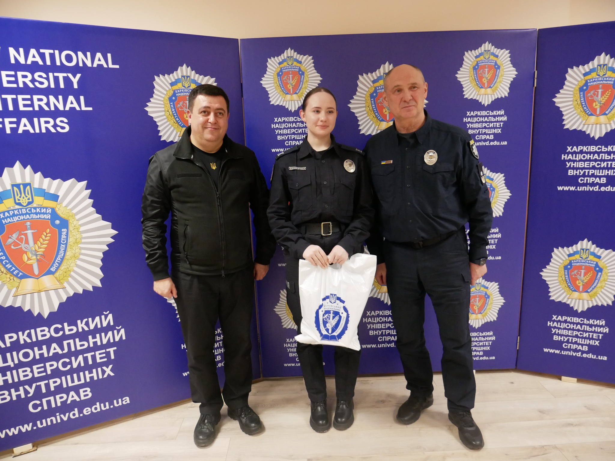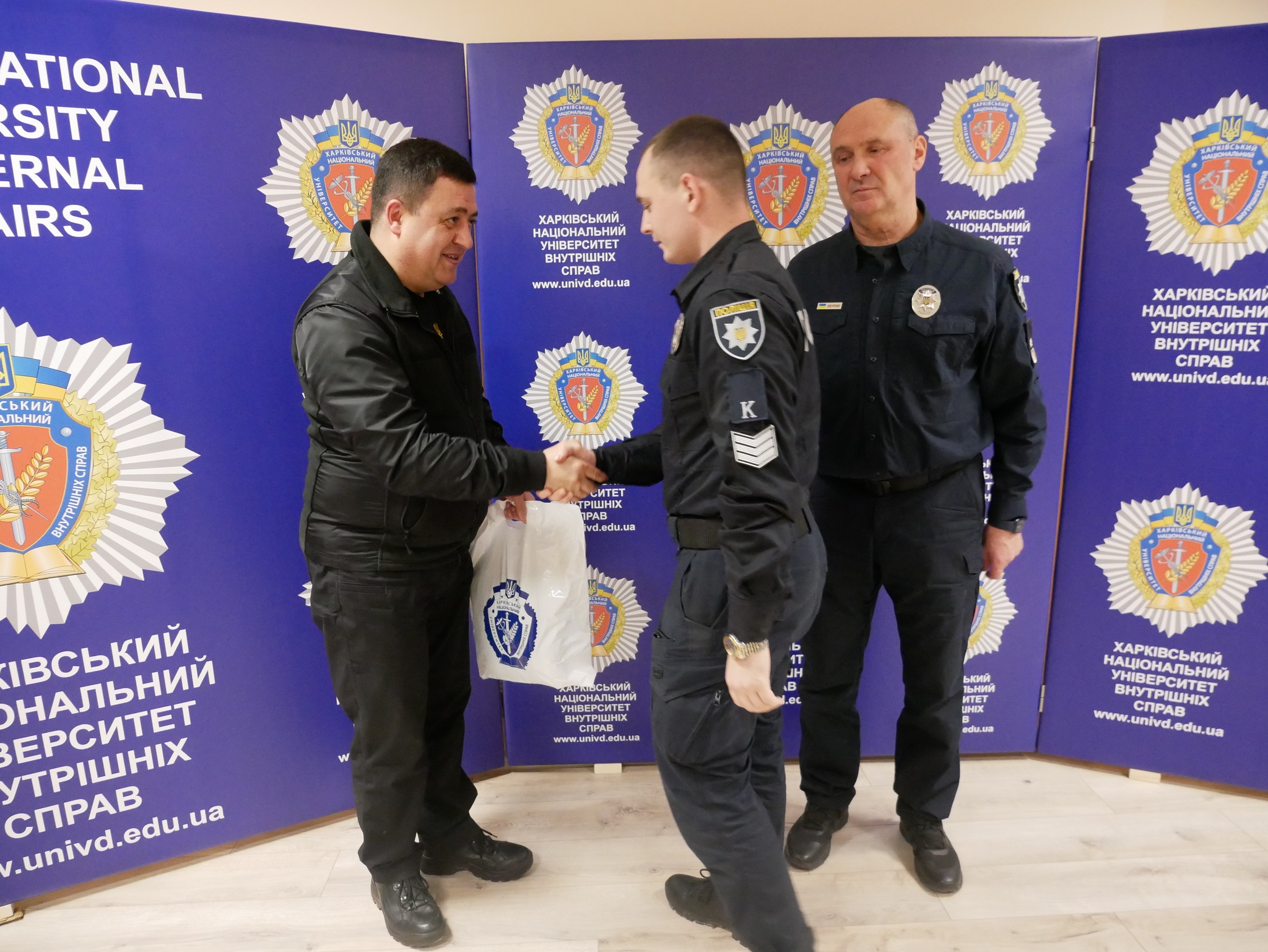 Заступник начальника ОВА (CDTO) Андрій Кавунець разом із ректором ХНУВС, генералом поліції третього рангу Валерієм Сокуренком, вручили дітям подарунки — маленькі символи турботи, які зігріватимуть їх у зимові дні.