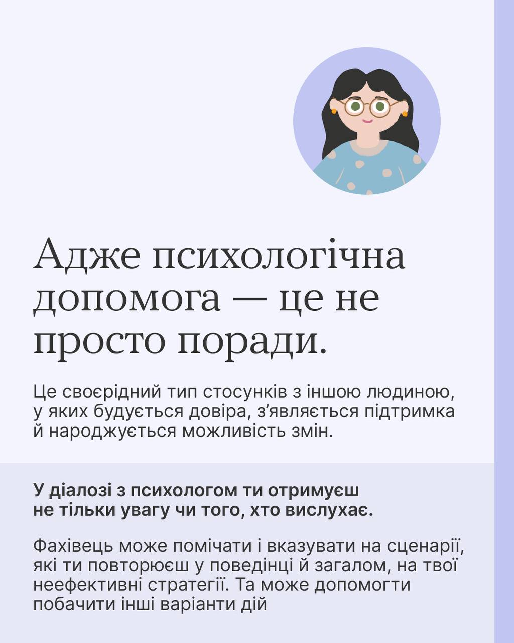 А головним інструментом психологічної допомоги завжди будуть стосунки між людьми, де з одного боку фахівець — із необхідними знаннями, рекомендаціями, які підтримають тебе. Читай у каруселі, чому та як це працює.