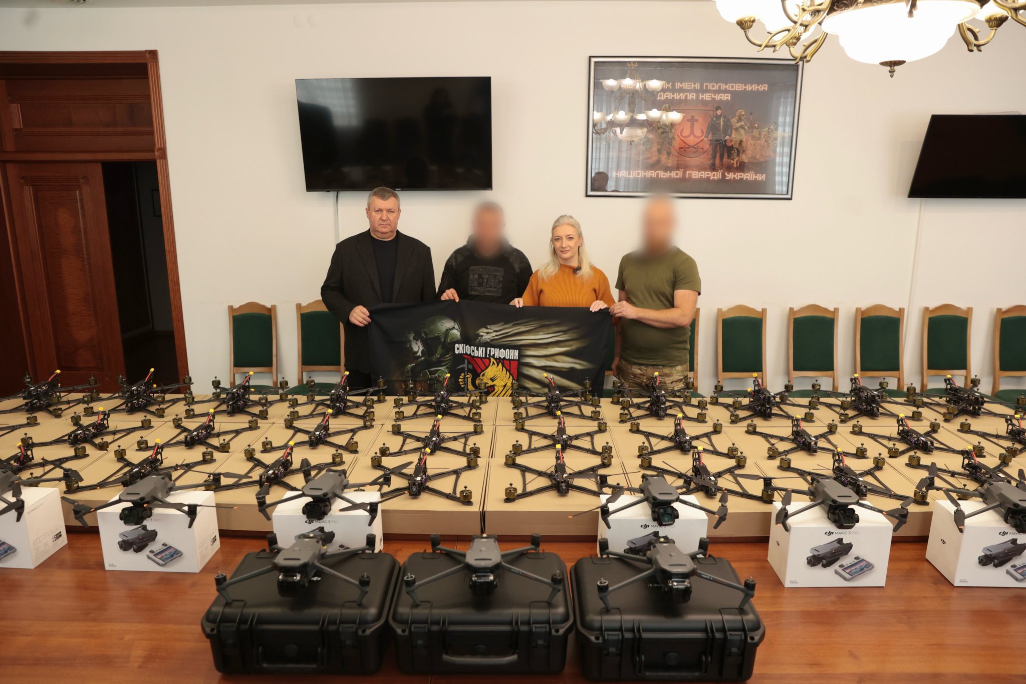 Перша заступниця начальника ОВА Наталя Заболотна та голова обласної Ради Вячеслав Соколовий передала воїнам 423 окремого батальйону безпілотних ударних систем «Скіфські грифони» квадрокоптери DJI Mavic 3 Pro, FPV 10 та DJI Mavic 3 Thermal.