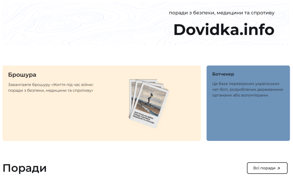 Матеріали на всіх ресурсах проєкту dovidkа.info підготовлені у співпраці з Державною службою України з надзвичайних ситуацій, Міністерством оборони України, Апаратом Головнкомандувача Збройних сил України та громадськими організаціями.