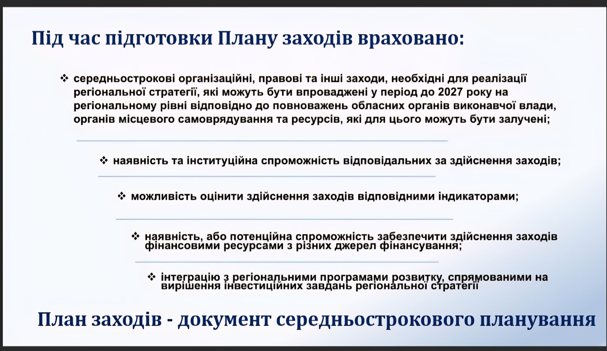 Зазначений План заходів – це результат злагодженої роботи фахівців обласної військової адміністрації, експертного середовища та партнерських інституцій. Його реалізація дозволить зберегти цілісність регіонального простору, посилити стійкість громад і створити передумови для відновлення та зростання.