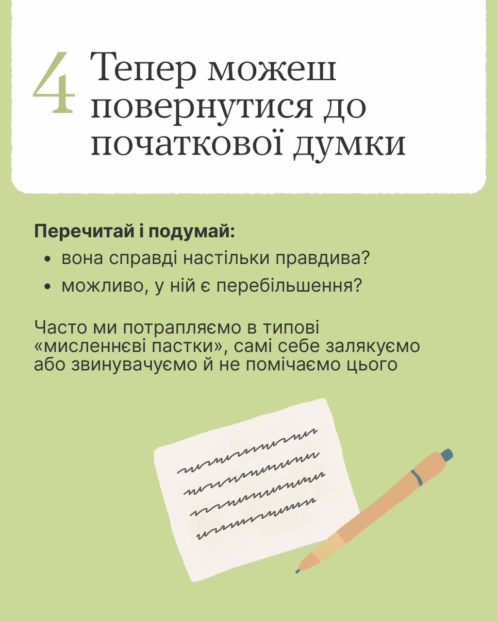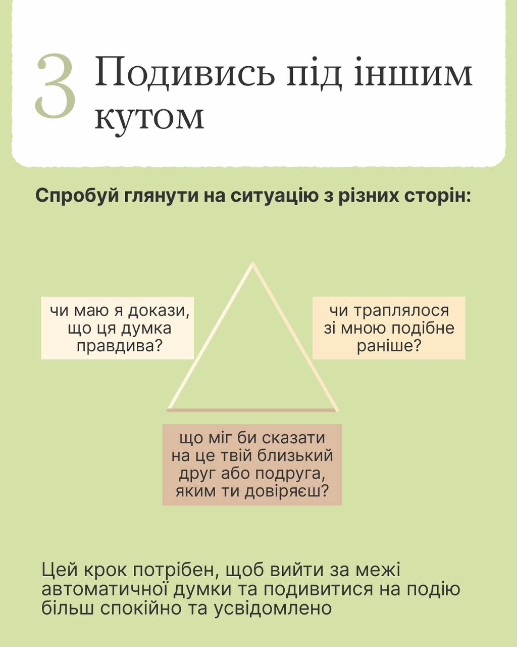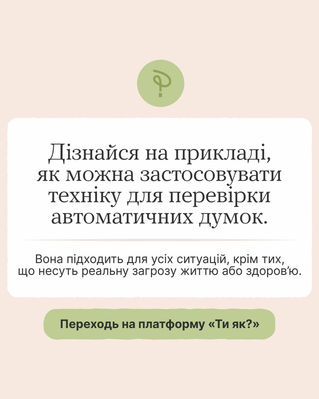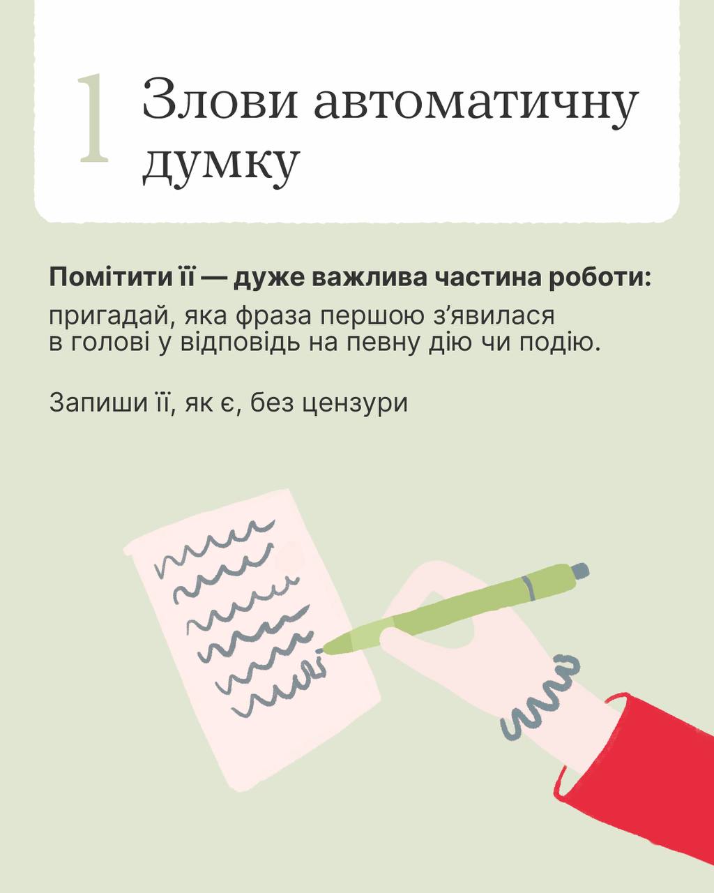 Якщо навчитися аналізувати такі автоматичні думки, можна усвідомити, що вони не визначають, яка ти людина. А отже, не керують твоїми діями.