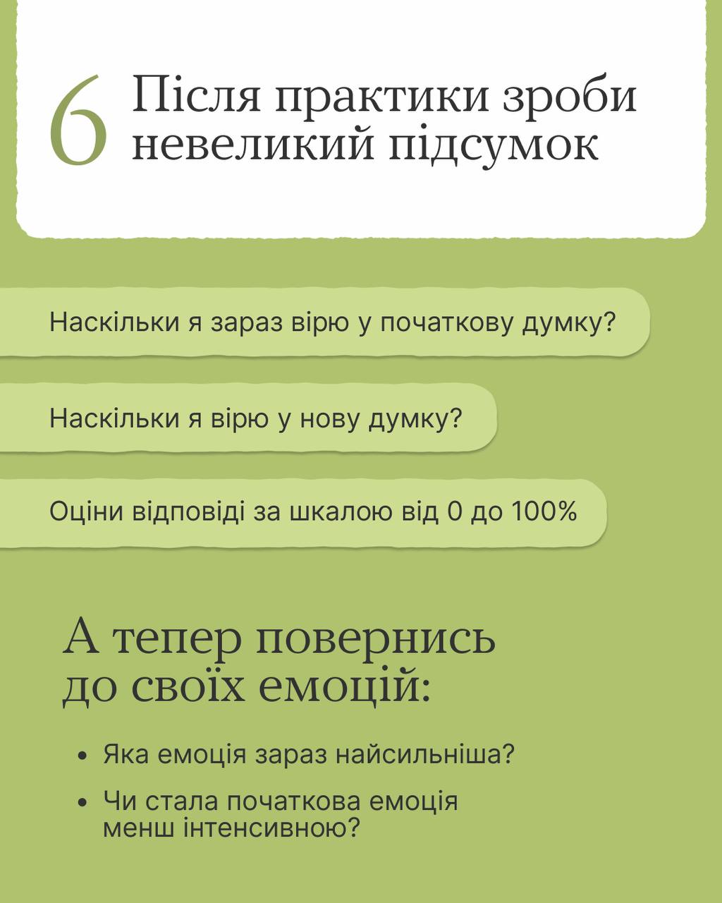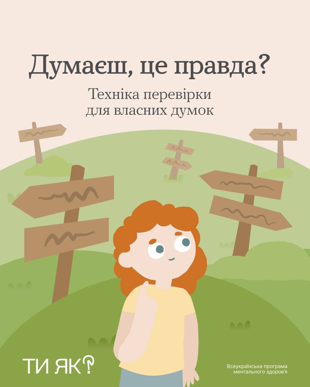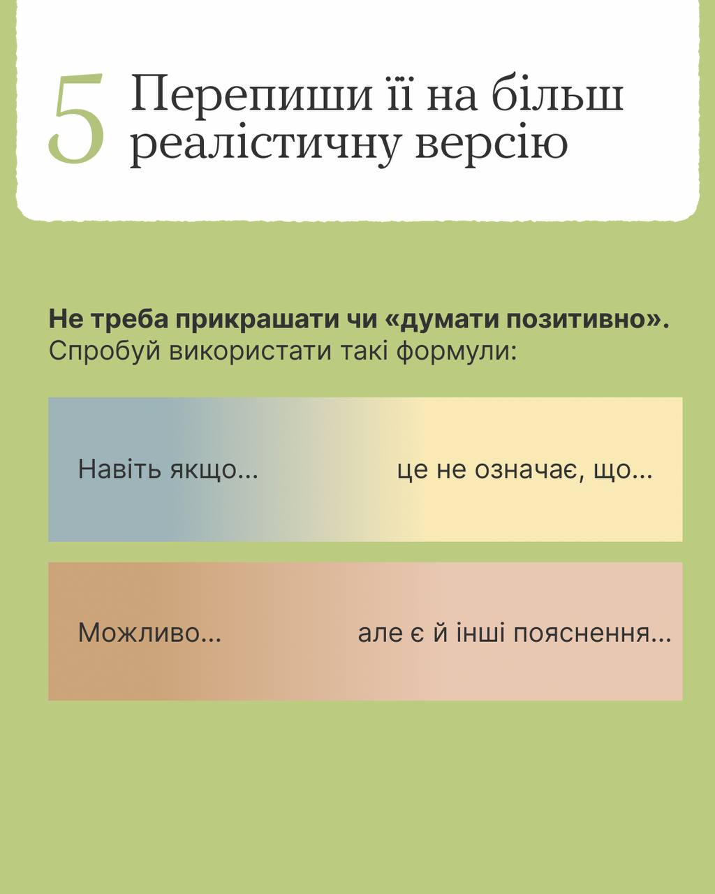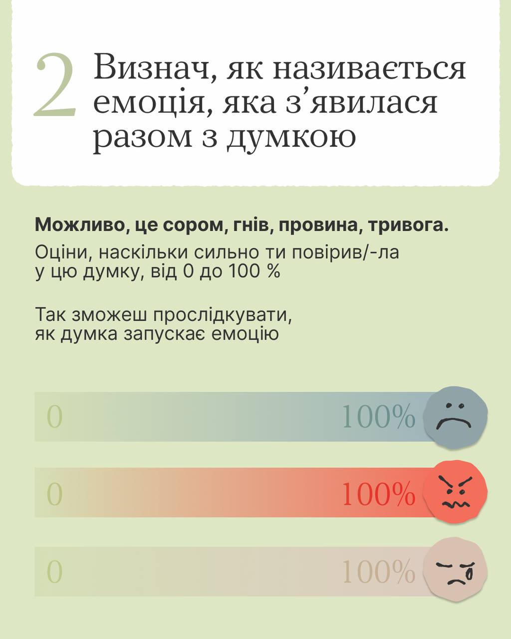 Якщо навчитися аналізувати такі автоматичні думки, можна усвідомити, що вони не визначають, яка ти людина. А отже, не керують твоїми діями.