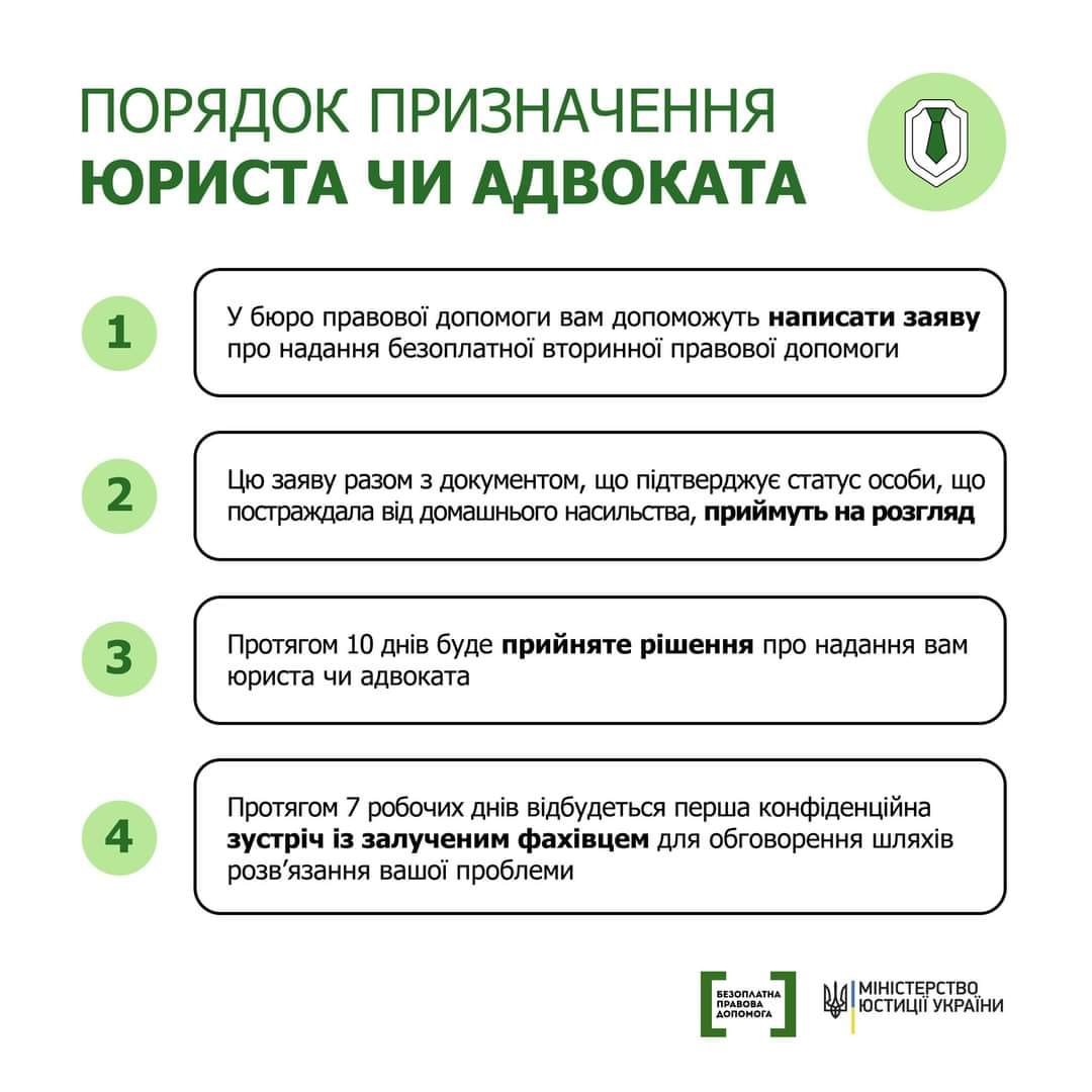 Постраждалі від домашнього насильства мають право на безоплатну вторинну правову допомогу, зокрема, на послуги адвоката чи юриста для представництва інтересів у суді.
