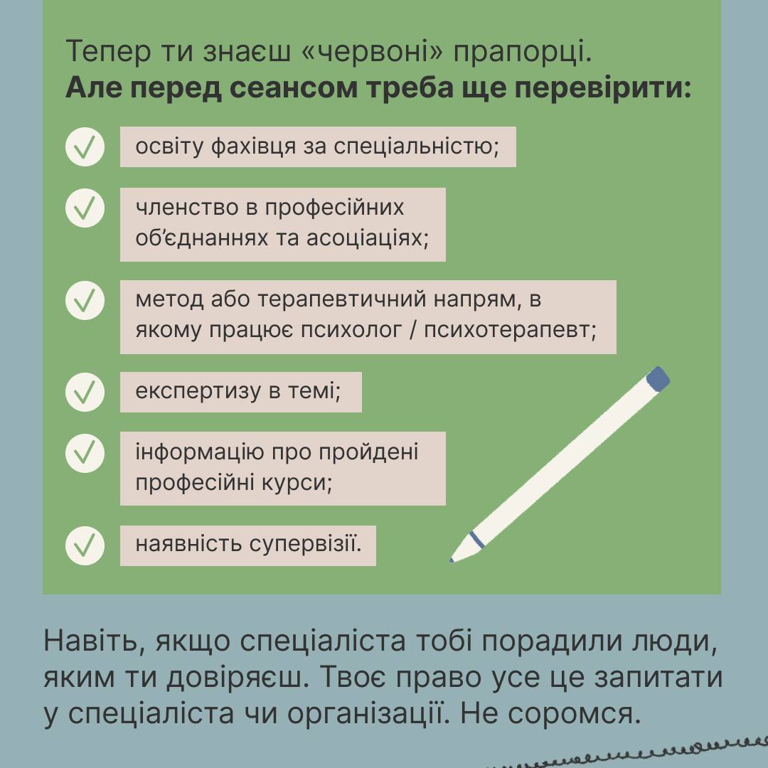 Перед першою консультацією гортайте карусель. Потім — переходьте на платформу «Ти як?», щоб прочитати усі вимоги до компетентного спеціаліста на офіційному сайті Всеукраїнської програми ментального здоров'я «Ти як?».