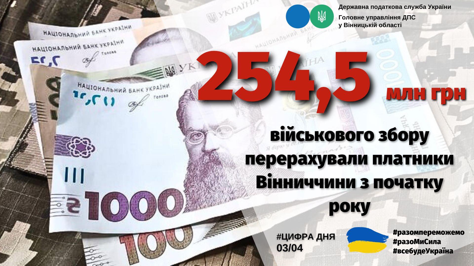 Упродовж І кварталу 2024 року платники податків Вінниччини перерахували до державного бюджету 254 млн 529,1 тис. грн військового збору.