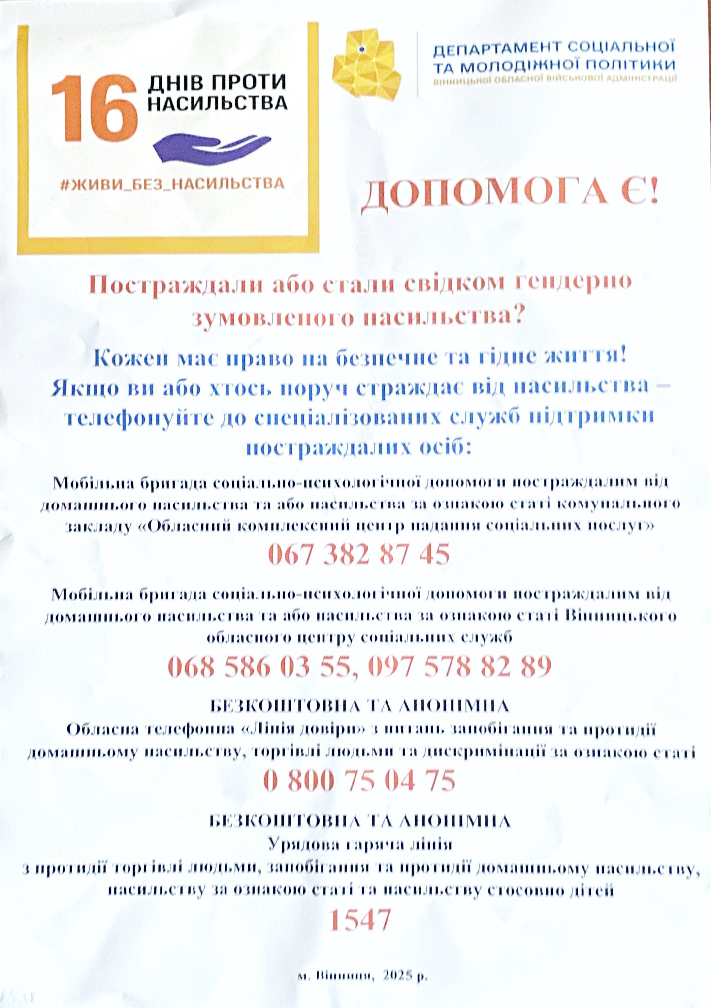 Щороку в Україні з 25 листопада до 10 грудня проводиться Всеукраїнська акція «16 днів проти насильства». Адже у світі постійно відбуваються війни, напади, дискримінація, приниження. Саме тому важливо збільшити розуміння та обізнаність про всі форми насильства у суспільстві, нагадати людям про те, що насильству немає виправдання у будь яких його проявах.