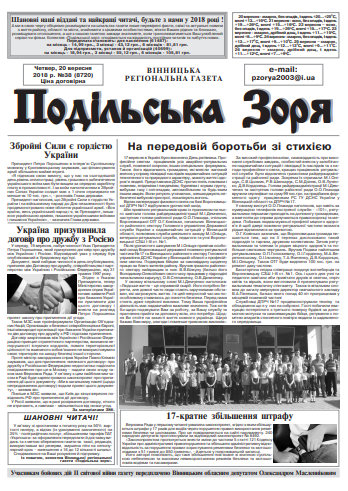 Регіональна газета "Подільська зоря" Вінницька регіональна газета "Подільська зоря" (архів 2018) №52 (27.12.2018) №49 (06.12.2018) №50 (13.12.2018) №51 (20.12.2018) №46 (15.11.2018) №47 (22.11.2018) №48 (29.11.2018) №43 (25.10.2018) №44 (01.11.2018) №45 (08.11.2018) №40 (04.10.2018) №41 (11.10.2018) №42 (18.10.2018) №37 (13.09.2018) №38 (20.09.2018) №39 (27.09.2018) №34 (23.08.2018) №35 (30.08.2018) №36 (06.09.2018) №31 (02.08.2018) №32 (09.08.2018) №33 (16.08.2018) №28 (12.07.2018) №29 (19.07.2018) №30 (26.07.2018) №25 (21.06.2018) №26 (28.06.2018) №27 (05.07.2018) №22 (30.05.2018) №23 (07.06.2018) №24 (14.06.2018) №19 (10.05.2018) №20 (17.05.2018) №21 (24.05.2018) №16 (19.04.2018) №17 (26.04.2018) №18 (03.05.2018) №13 (29.03.2018) №14 (05.04.2018) №15 (12.04.2018) №10 (08.03.2018) №11 (15.03.2018) №12 (22.03.2018) №7 (15.02.2018) №8 (22.02.2018) №9 (01.03.2018) №4 (25.01.2018) №5 (01.02.2018) №6 (08.02.2018) №1 (04.01.2018) №2 (11.01.2018) №3 (18.01.2018) Вінницька регіональна газета "Подільська зоря" (архів 2017) Вінницька регіональна газета "Подільська зоря" (архів 2016)